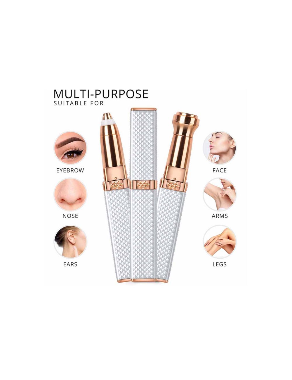 Este novo depilador facial 2 em 1 é a ferramenta perfeita para a limpeza e manutenção diária, podendo ser utilizado nas sobrancelhas, nariz, buço (superior e inferior), bochechas, queixo, pescoço, etc. A cabeça de precisão permite a utilização na parte superior e inferior das sobrancelhas e entre elas, mesmo nas áreas mais pequenas. Remove instantaneamente e sem dor os pelos indesejados e dispersos das sobrancelhas, proporcionando uma experiência de depilação simples e confortável. Possui bateria de lítio integrada, recarregável através de cabo USB; o seu tamanho compacto, semelhante a um batom, permite que seja guardado facilmente numa carteira ou bolsa.
