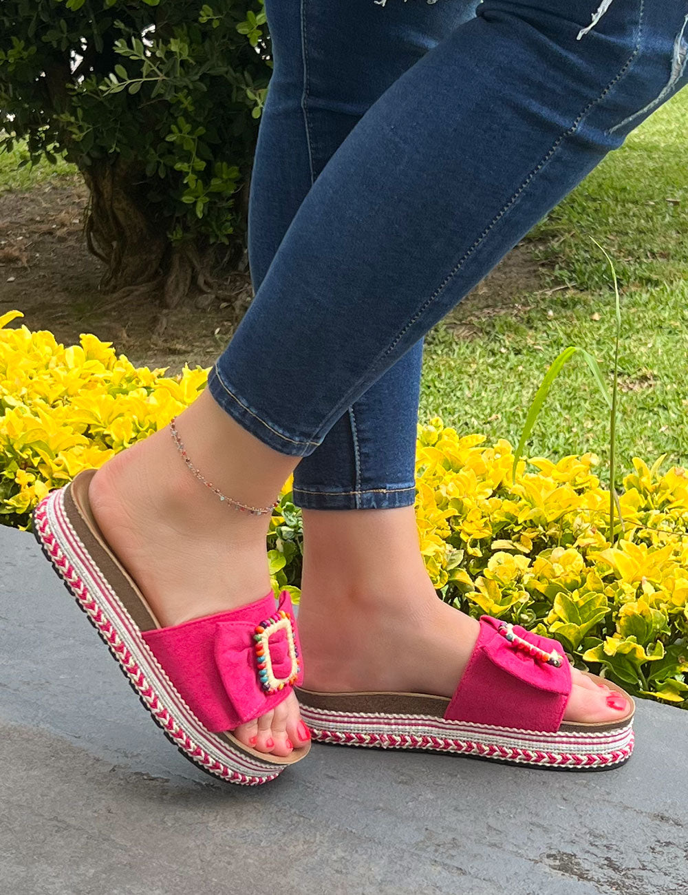 O design apresenta uma tira larga sobre o peito do pé em material Rosa Choque/Fúcsia com uma fivela decorativa colorida. A plataforma é revestida com palha trançada (juta ou ráfia) e possui detalhes de costura em cor contrastante na lateral.