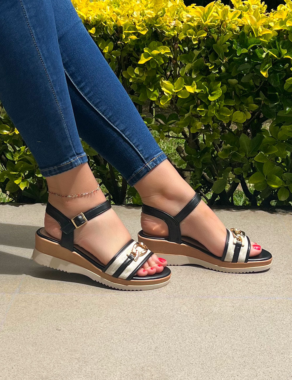 O modelo ARUSA em Preto e Branco é uma sandália de estilo casual-chique e moderno, ideal para o dia a dia, passeios e para quem procura conforto com um toque fashion. Caracteriza-se pela sua sola plataforma com diferentes camadas de cores. O salto tem aproximadamente 6 cm de altura e a plataforma frontal é de cerca de 2,5 cm, o que resulta numa inclinação confortável de 3,5 cm.