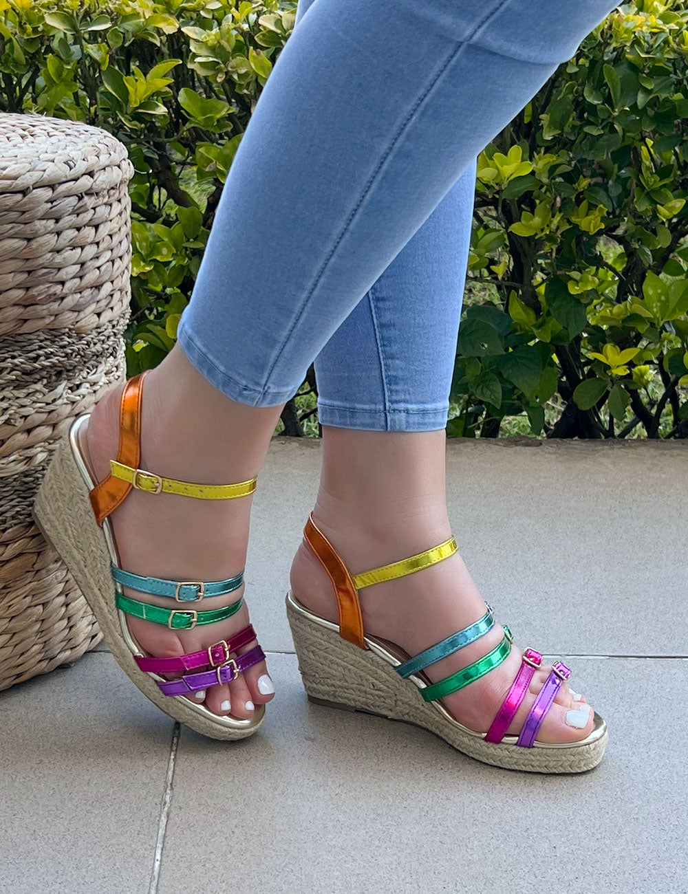 ✅ Detalhe: Tiras em cores vibrantes e metálicas sobre a cunha em palha.