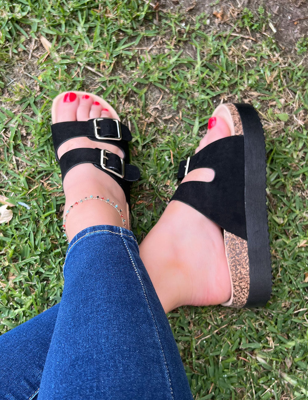 ✅ Detalhe: Tiras ajustáveis com fivelas e sola chunky com efeito cortiça.