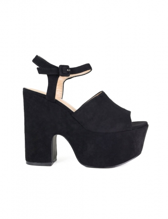 Sandálias de plataforma em tom preto, com um design de salto grosso/bloco e recortes, e um fecho de fivela no tornozelo. Possuem uma tira larga no peito do pé e são abertas na ponta, o que as torna ideais para um estilo casual e de moda, especialmente em climas quentes.